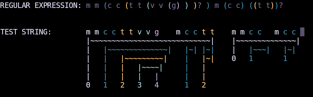 - Basic regex parsing and test string mathches and captures groups highlighting in different color per group layel.